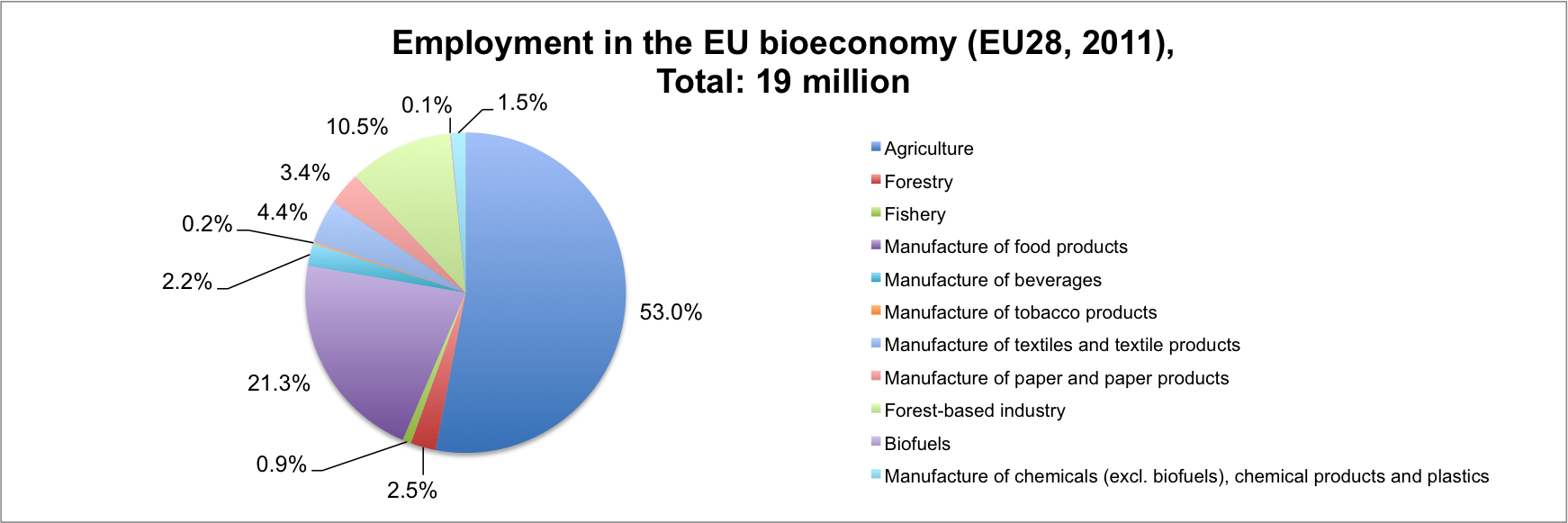 Figure 1: Employment in the EU bioeconomy in 2011 (Several Eurostat datasets; Agriculture: Agricultural labour input statistics; Forestry and Fishery: Employment by sex, age and detailed economic activity; Other sectors: Annual detailed enterprise statistics for industry; own estimations)