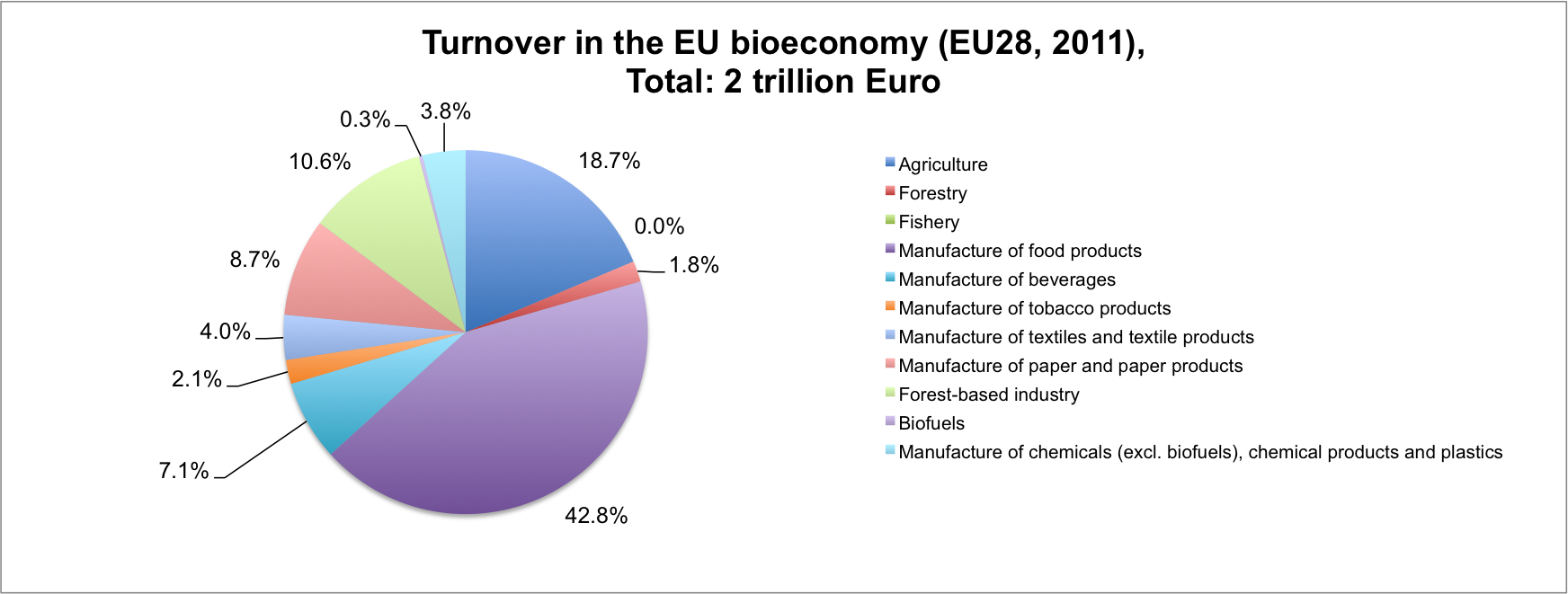 The following two figures show the total employment and turnover of the bioeconomy in the EU-28 in the year 2011. These two figures are almost entirely based on available Eurostat data (Eurostat 2013a – d). Most of the sectors can be regarded as fully bio-based (agriculture, forestry and fishery as well as the manufacture of food products, beverages, tobacco products, paper and paper products, forest-based industry and biofuels).