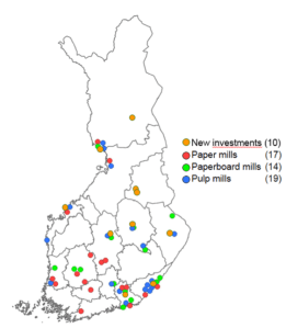 Figure 1. Paper-, paperboard-, pulp mills and new investments in Finland. SOURCE: Original figures by Finnish Forest Industries Federation. New investments (orange ball shape) have been added later.