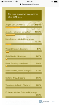 We heartily congratulate him on this important recognition and sincerely thank our readers for the great participation in the survey. The blog has actually registered a boom of visits the last 5 days. As usual, we would like to underline that the bioeconomy revolution is a reality thanks to visionary managers like Eck , the other nine selected along with him in the list of the 10 most innovative bioeconomy CEOs and to all those who in different roles contribute to research, develop and commercialize new bio-based products.